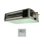 Kompaktowa powietrzna pompa ciepła typu split z inwerterem, idealna do montażu płaskiego wewnątrz podwieszanego sufitu lub za dekoracyjną ścianą. Ten jednostka o klasie energetycznej A++ jest wyposażona w przewodowy sterownik z tygodniowym timeraem umożliwiającym wygodną obsługę montowaną na ścianie.