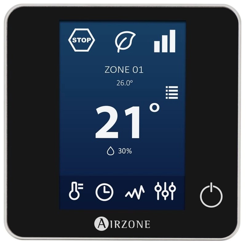 Color touchscreen interface with capacitive display, steel and tempered-glass finish, for managing one zone in an Airzone system. Powered from the main board, offered in white or black.