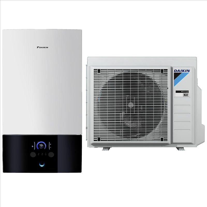 The outdoor unit draws energy from the air to deliver heating, cooling and hot water. It harvests up to 75 % of the energy from ambient air, topped up by electricity. The air-to-water heat pump uses a compressor and refrigerant to transfer this energy to water, which is then heated and circulated through your home as required.