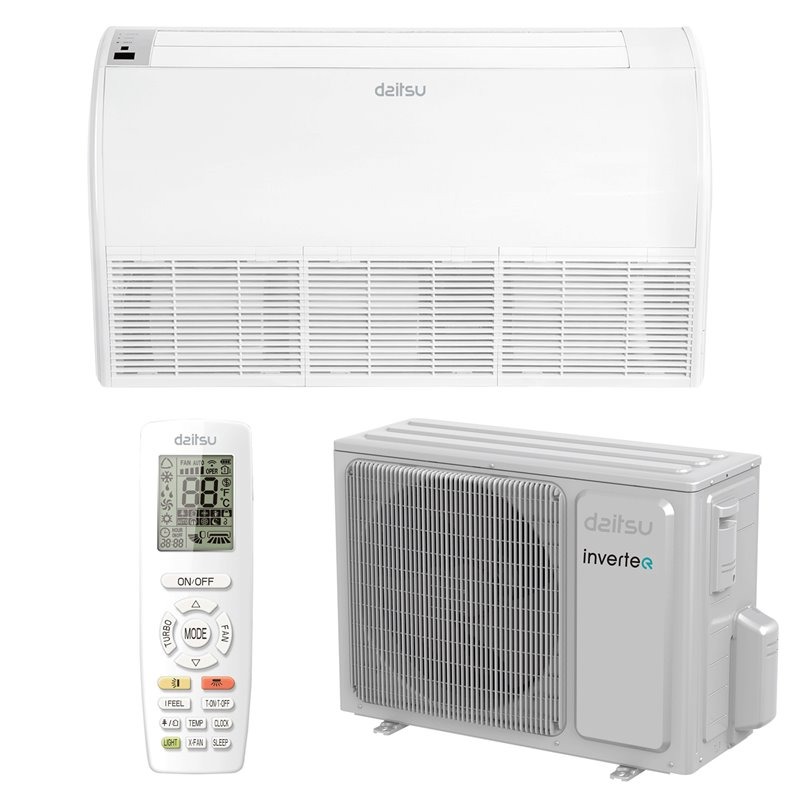Daitsu’s Atlas ceiling-floor air conditioner range pairs an auto-sweep fan with multi-speed settings inside a sleek, minimalist frame.