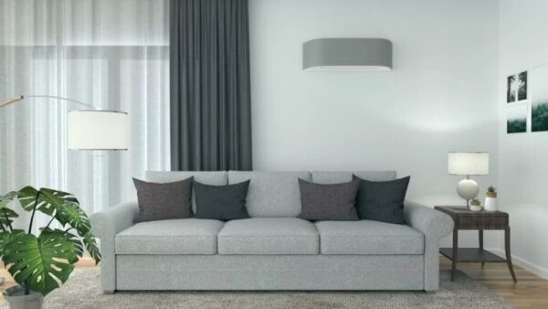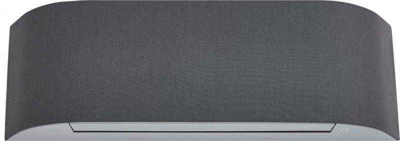 Wall-mounted Haori 10 R32 4.6 kW mono-split air-conditioning set, supplied with two light-grey and anthracite-grey decorative fabric panels.